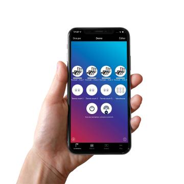 Die drahtlose Schréder ITERRA PRESS-Fernbedienung ermöglicht es Beleuchtungsszenarien auszulösen und verhindert gleichzeitig, dass Einstellungen verändert werden. Diese funktioniert als All-in-One-Fernbedienung, die Zugriff auf die Steuerungsfunktionen der Schréder ITERRA Mobil-App bietet.