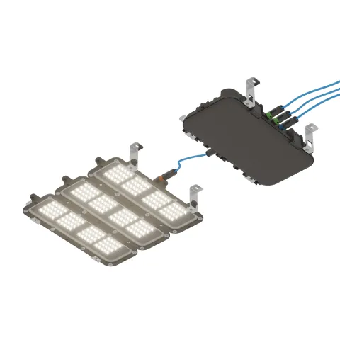 Mit externen Versorgungseinheiten ermöglicht OMNISTAR jede Art von Konfiguration und gewährleistet Flexibilität bei der Verwaltung wichtiger Aspekte wie Gewicht, Zugang, Umgebungsgestaltung und Platzbedarf. OMNISTAR erleichtert das Design anspruchsvoller Anwendungen wie Tunnel-, Vorfeld- und Hochmastanlagen. Schnellanschlüsse sowohl an der Leuchte als auch am Getriebe erleichtern die Installation.