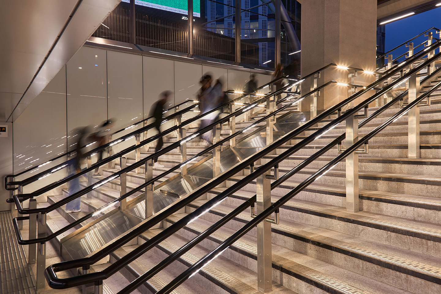 Plus de 350 mètres de main courante chaude au toucher ont été déployés sur trois accès à la station — Cowper Street, entrée principale et entrée nord (non éclairée), intégrant 234 modules ALINEA, y compris un éclairage de secours.