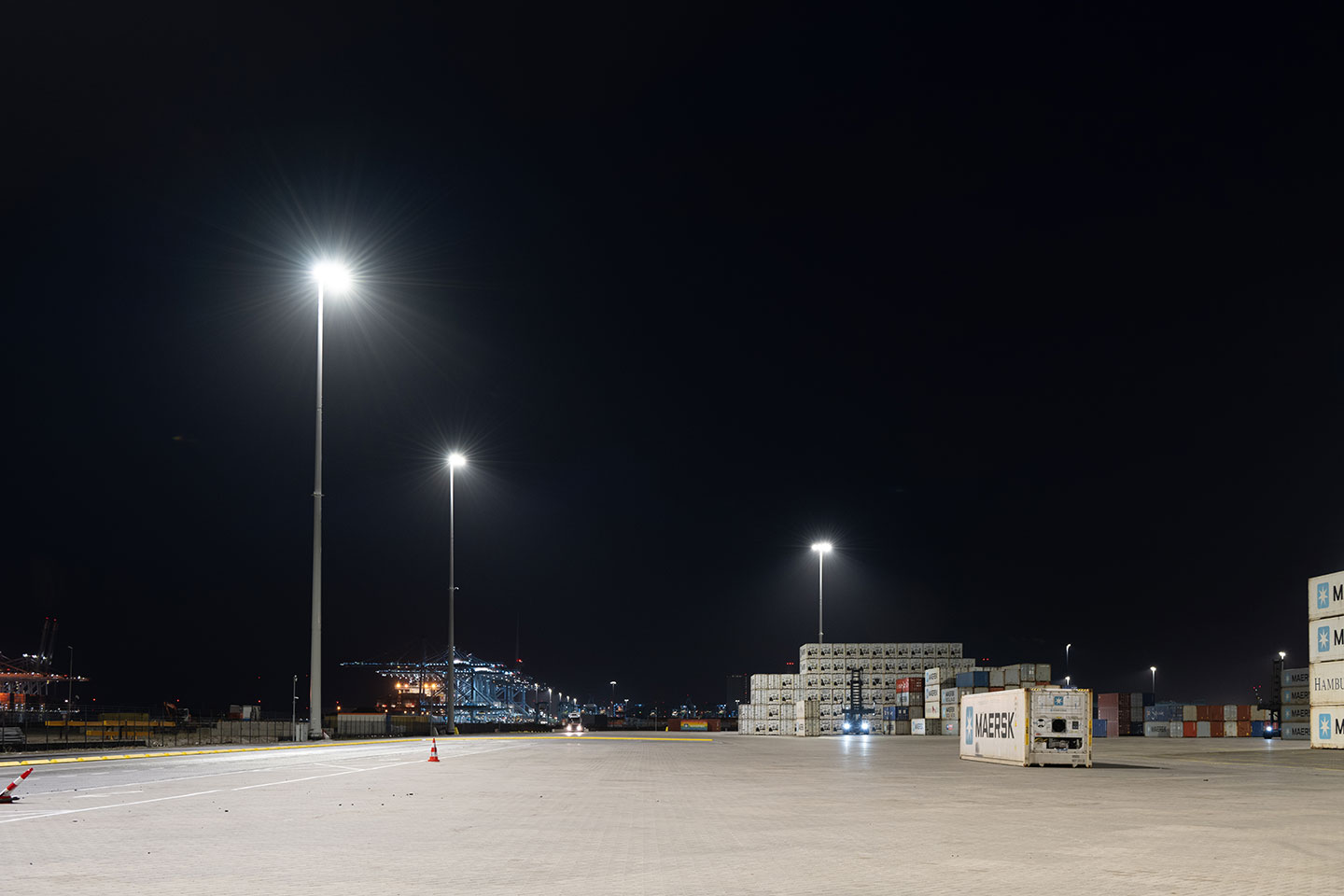 Per garantire sicurezza e visibilità ottimale in tutte le condizioni atmosferiche, abbiamo proposto il proiettore BRITELINE, altamente efficiente dal punto di vista energetico e dalle prestazioni elevate, trattato per soddisfare gli standard C5 per ambienti altamente corrosivi. Un totale di 78 proiettori sono stati montati su quattordici pali Valmont alti 45 metri e posizionati strategicamente per fornire un'illuminazione uniforme in tutta l'area, tenendo conto delle ombre dei container. Le misurazioni effettuate in loco dopo l'installazione hanno confermato che i livelli di illuminazione erano superiori al previsto.