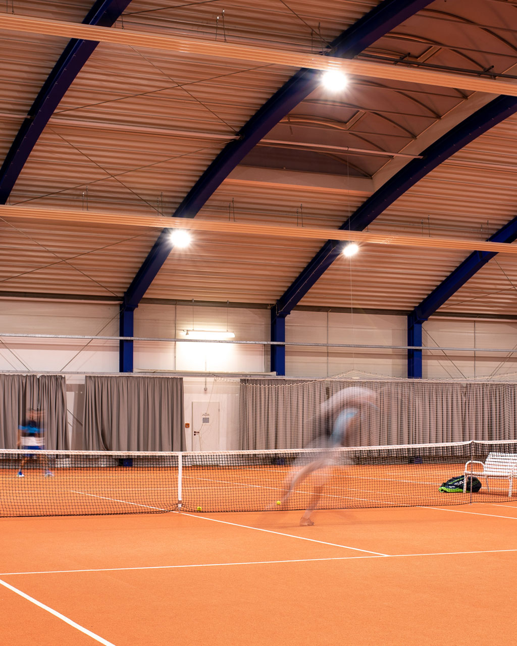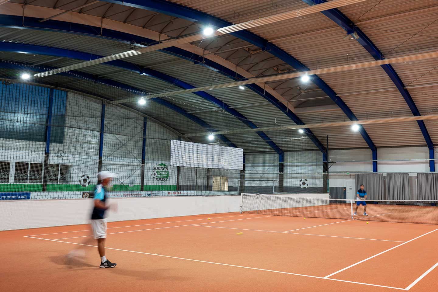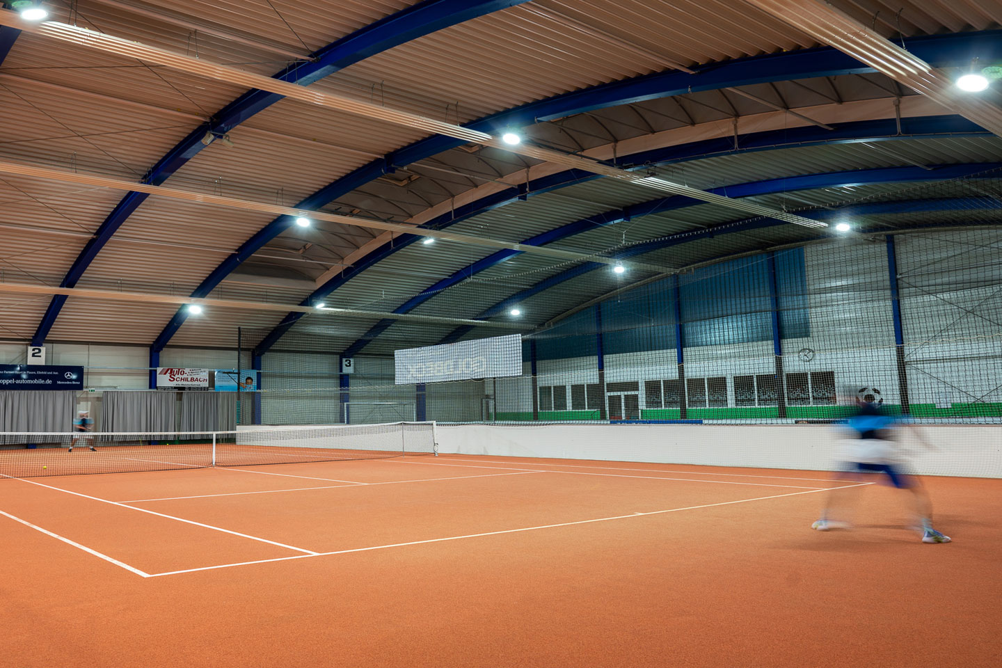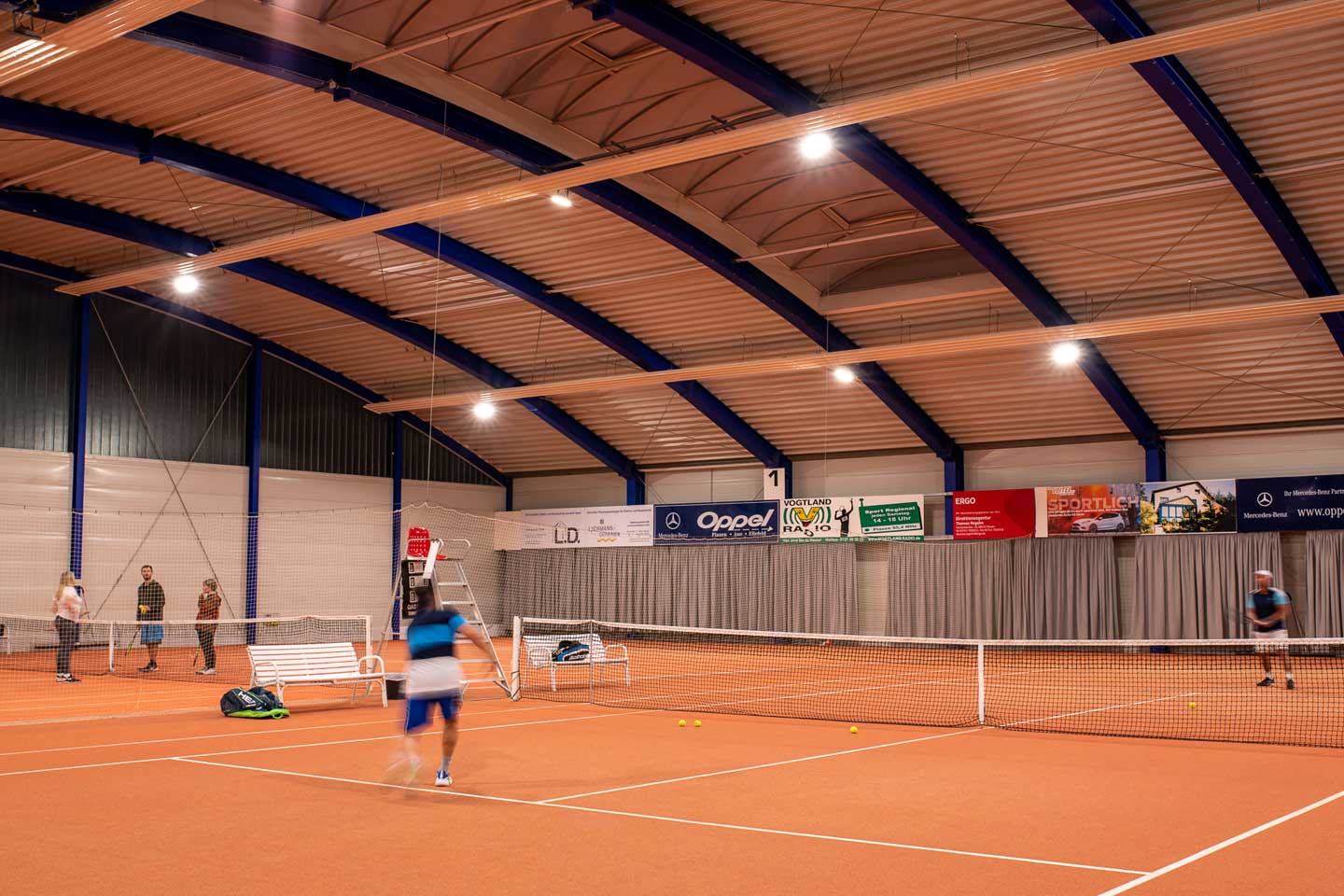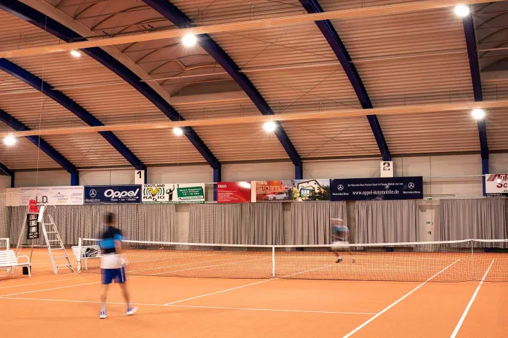 spazio interno ospita 2 campi da tennis e un campo da calcio a cinque. La nuova illuminazione sportiva doveva garantire un'elevata uniformità in tutta la sala per assicurare una perfetta visibilità a tutti i giocatori con un consumo energetico ridotto. Poiché il soffitto è ad arco per garantire un equilibrio ottimale tra i requisiti di altezza per i diversi sport, il progetto illuminotecnico doveva essere pianificato con attenzione. Abbiamo collaborato con lo studio di ingegneria Lachmann-Dominok per garantire progettazione ed installazione perfette.