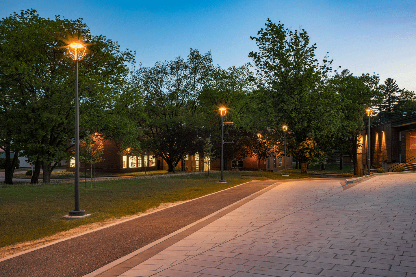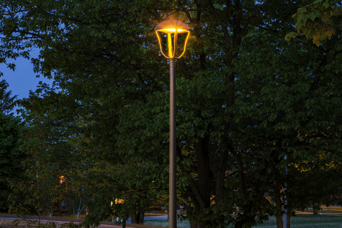 Le lanterne sono dotate di LED color ambra puro (1.800 K) in omaggio all'illuminazione stradale storica e per creare uno spazio piacevole in cui studenti e personale possono muoversi in sicurezza dopo il tramonto, riducendo al minimo il consumo di energia. I LED color ambra producono anche meno bagliori nel cielo e sono meno dannosi per la fauna selvatica, quindi è stata una soluzione vincente per tutti.